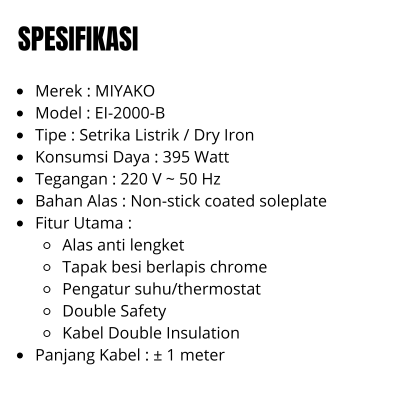 #STMY20000F #SETRIKA MIYAKO EI-2000-B #setrika miyako #penghalus pakaian #setrika listrik #peralatan rumah tangga #peralatan elektronik #alat elektronik
